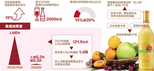 荔枝酒、楊梅酒、桑椹酒、五味子酒、藍莓酒、蘋果酒……隨著人們健康消費意識的提升,如今以葡萄酒為代表的果酒產業正迎來新的發展機遇期。《2014年至2018年中國果酒研究報告》顯示,目前我國果酒銷售額年增長率為15%,預計2018年果酒行業規模將超過2000億元。