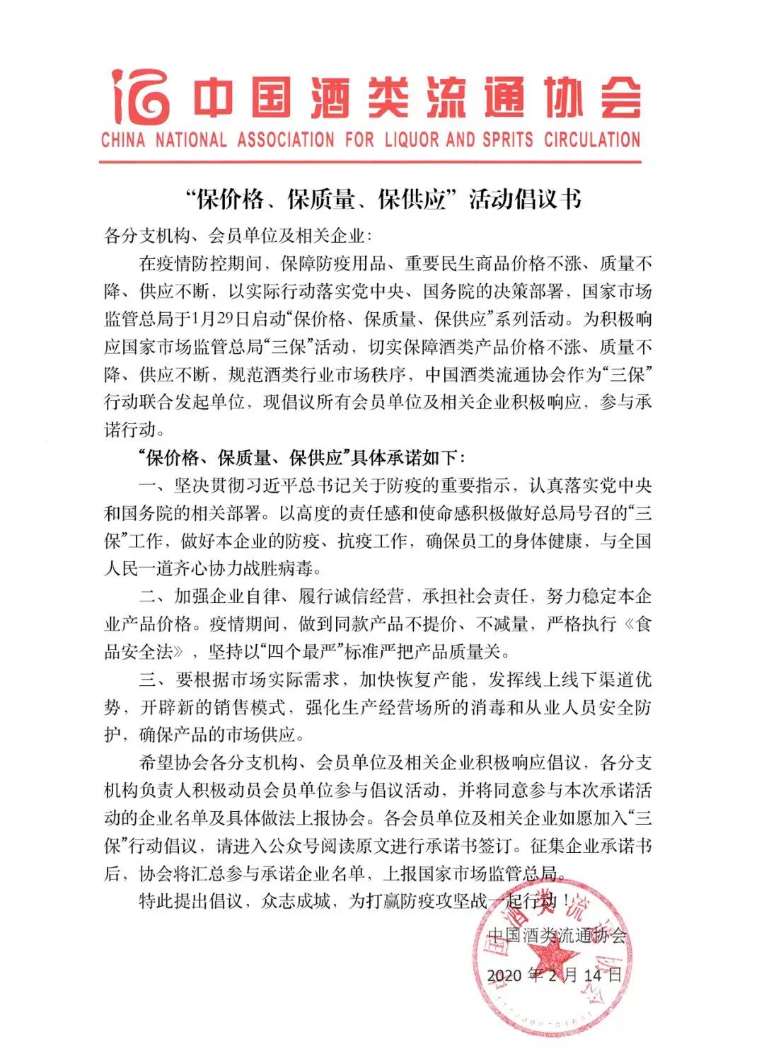 經濟日報-中國經濟網北京2月17日訊 為積極響應國家市場監管總局于1月29日啟動“保價格、保質量、保供應”系列活動,中國酒類流通協會2月14日向所有會員單位及相關企業發出參加“三?!毙袆映h。至 2月17日中午,共有403家酒類企業積極報名參與“三保”行動并做承諾。