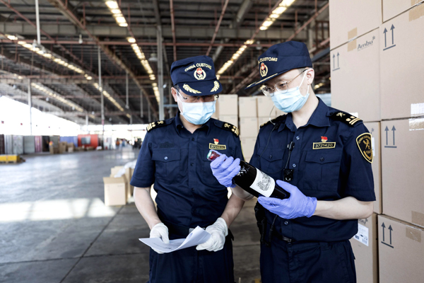 廈門海關(guān)關(guān)員驗(yàn)放關(guān)區(qū)首批跨境電商渠道進(jìn)口高端葡萄酒。劉超攝
