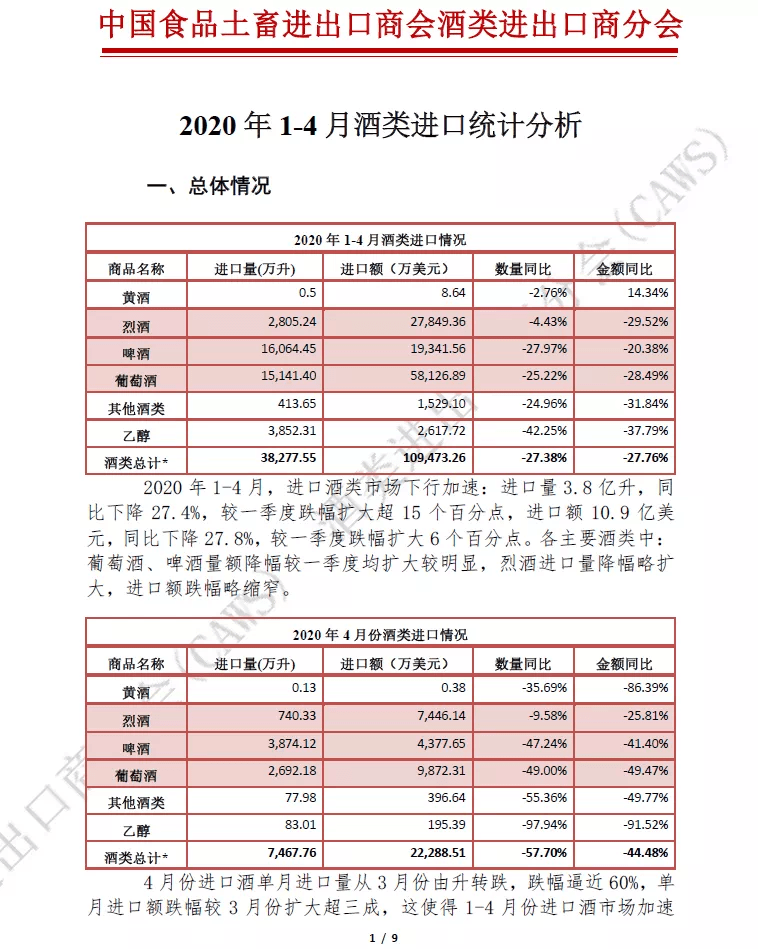 新京報(bào)訊(見(jiàn)習(xí)記者 鄭明珠)2020年1-4月,進(jìn)口酒類(lèi)市場(chǎng)下行加速,進(jìn)口量3.8億升,同比下降27.4%,較一季度跌幅擴(kuò)大超15個(gè)百分點(diǎn),進(jìn)口額10.9億美元,同比下降27.8%,較一季度跌幅擴(kuò)大6個(gè)百分點(diǎn)。該數(shù)據(jù)源于6月8日中國(guó)食品土畜進(jìn)出口商會(huì)酒類(lèi)進(jìn)出口商分會(huì)發(fā)布的《2020年1-4月酒類(lèi)進(jìn)口統(tǒng)計(jì)分析》。分析稱(chēng),各主要進(jìn)口酒類(lèi)中:葡萄酒,啤酒量額降幅較一季度均擴(kuò)大較明顯,烈酒進(jìn)口量降幅略擴(kuò)大,進(jìn)口額跌幅略縮窄。