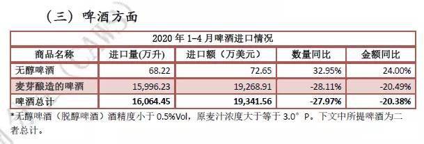 1-4月,啤酒進(jìn)口量1.6億升,進(jìn)口額1.9億美元,量額跌幅較一季度均擴(kuò)大約一成,占酒類(lèi)進(jìn)口總額的17.7%。