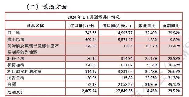 分析指出,1-4月,烈酒進(jìn)口量2805萬(wàn)升,維持個(gè)位數(shù)跌幅,較一季度擴(kuò)大2個(gè)百分點(diǎn),進(jìn)口額2.8億美元,降幅較一季度回調(diào)1個(gè)百分點(diǎn),占酒類(lèi)進(jìn)口總額的25.4%。