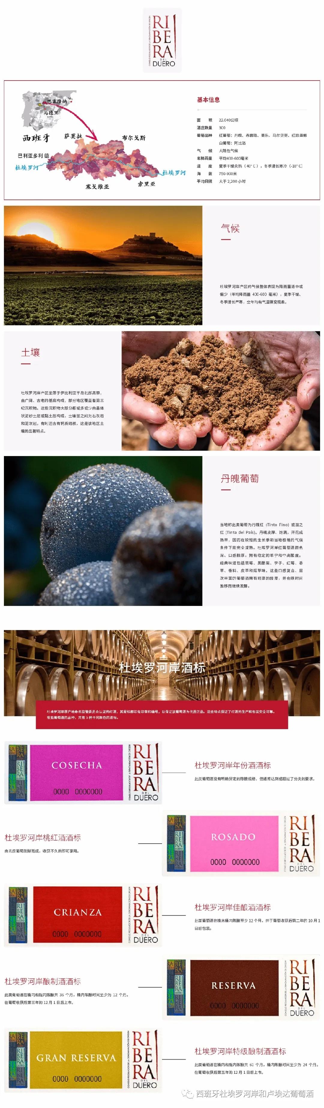 從1980年代初期幾乎不為人所知,到現(xiàn)在聞名于世,簡直是西班牙北部的現(xiàn)代紅葡萄酒的奇跡。該地區(qū)沿著杜埃羅河(Río Duero)的流向從索利亞省(Soria)向西流經(jīng)布爾戈斯?。˙urgos),再延伸至瓦亞多利德?。╒alladolid),葡萄園多位于河岸三公里以內(nèi)的距離。產(chǎn)區(qū)范圍115公里長,35公里寬,共計有21000公頃。